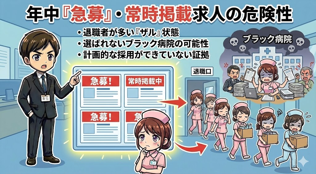 人事が教える!求人票の「ブラック予備軍」4つの危険サイン(長時間労働・給与の不透明さ・人間関係トラブル・高い離職率)を解説する看護師・人事キャラのイラスト 病院選び・求人探し