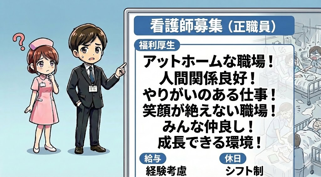 採用にあたって、求人票は「広告」です。 広告である以上、わざわざ自分たちの欠点を書く病院はありません。それどころか、法律の隙間を縫うような表現で、ブラックな実態をホワイトに見せかけているケースすらあります。